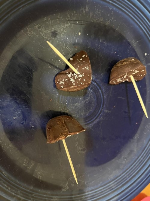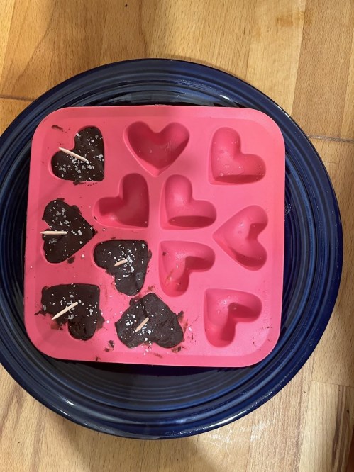 However, working with it is challenging. The folks at Modernist Cuisine solved one of the greatest mistakes that people make while working with chocolate into a wonderful treat. I decided it would be a great time to try it; I had a couple of half-empty chocolate bars, and the idea had been percolating in my mind for a while. I used a mix of 100% and 60% chocolate. The abstract concept is that when one adds water to melted chocolate, the cocoa particles clump together, making the result thick and grainy, which is obviously not ideal for most functions. If one adds a drop of water, the chocolate is perfect for piping into shapes or as the base of hot chocolate or a ganache. If one adds about a tablespoon, they’ll end up with a thick paste. I tried to do the former but my makeshift piping bag didn’t work out. I ended up scraping all of it back into my double boiler and adding some more water. From that, I tried rolling it out into little logs attached to the same skewers. It was visually unappealing, to say the least. I scraped out all of that chocolate and packed it into a heart-shaped mold that my family got from IKEA. I sprinkled some coarse salt on top and stuck it into the freezer. It turned out wonderfully. For the garnishes, anything works. Chopped nuts, dried fruit, or Fleur de Sel would all work great. I think some sugar baked in the oven at 400° F until melted and a dark color, then smashed into shards, would make it even more flavorful